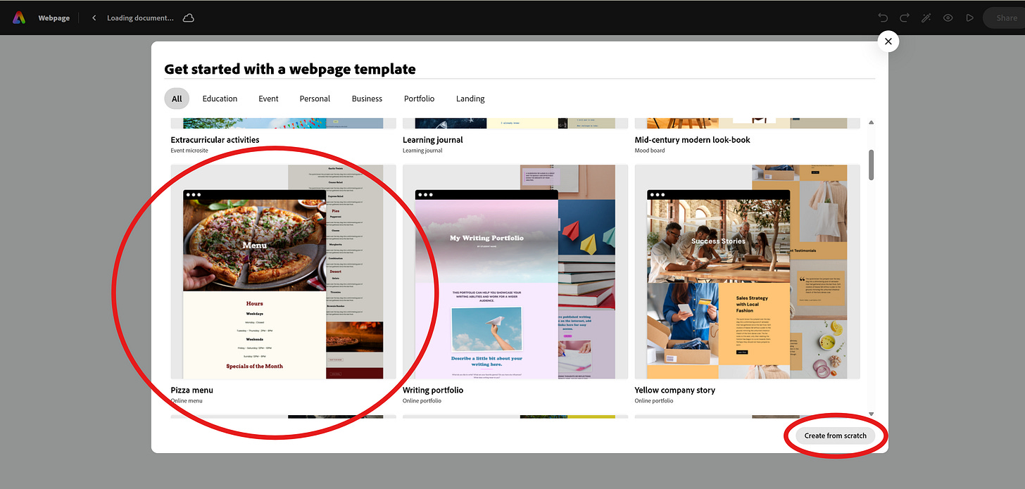 Start with either a template or “Create from Scratch” (bottom right-hand corner)
